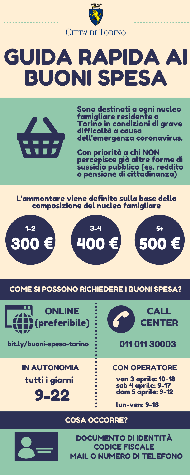 Famiglie in difficoltà a causa dell’emergenza Covid-19: è ora possibile ottenere i buoni spesa della Città di Torino per fare fronte alle necessità essenziali. La domanda deve essere presentata online. La priorità va a coloro che non stanno ricevendo alcun sostegno economico pubblico (per esempio: reddito di cittadinanza, REI, NASPI, indennità di mobilità, cassa integrazione guadagni).