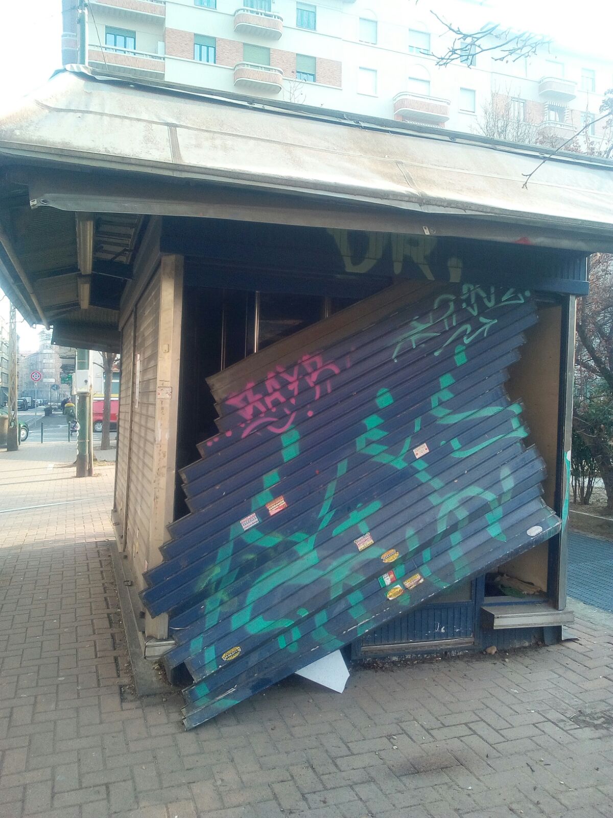 La serranda, ormai quasi del tutto divelta, penzola sulla facciata ovest dell’edicola di fronte a via Rivara: una barriera totalmente inefficace a fermare chi intende introdursi all’interno (e succede spesso), ma perfetta come rappresentazione simbolica dell’avanzare del degrado e dell’abbandono in tutta la piazza.