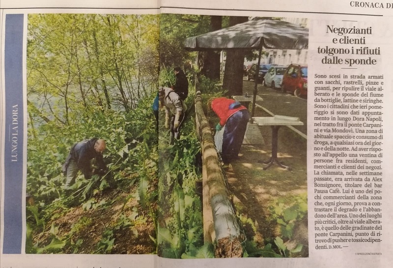 – con un’iniziativa resa nota con largo anticipo, domenica 18 aprile u.s. decine di cittadini, residenti e commercianti di buona volontà ed encomiabile senso civico si sono organizzati e armati di rastrelli, palette e scope hanno ripulito le banchine, i marciapiedi e le sponde della Dora nel tratto compreso tra il ponte Carpanini e via Mondovì;