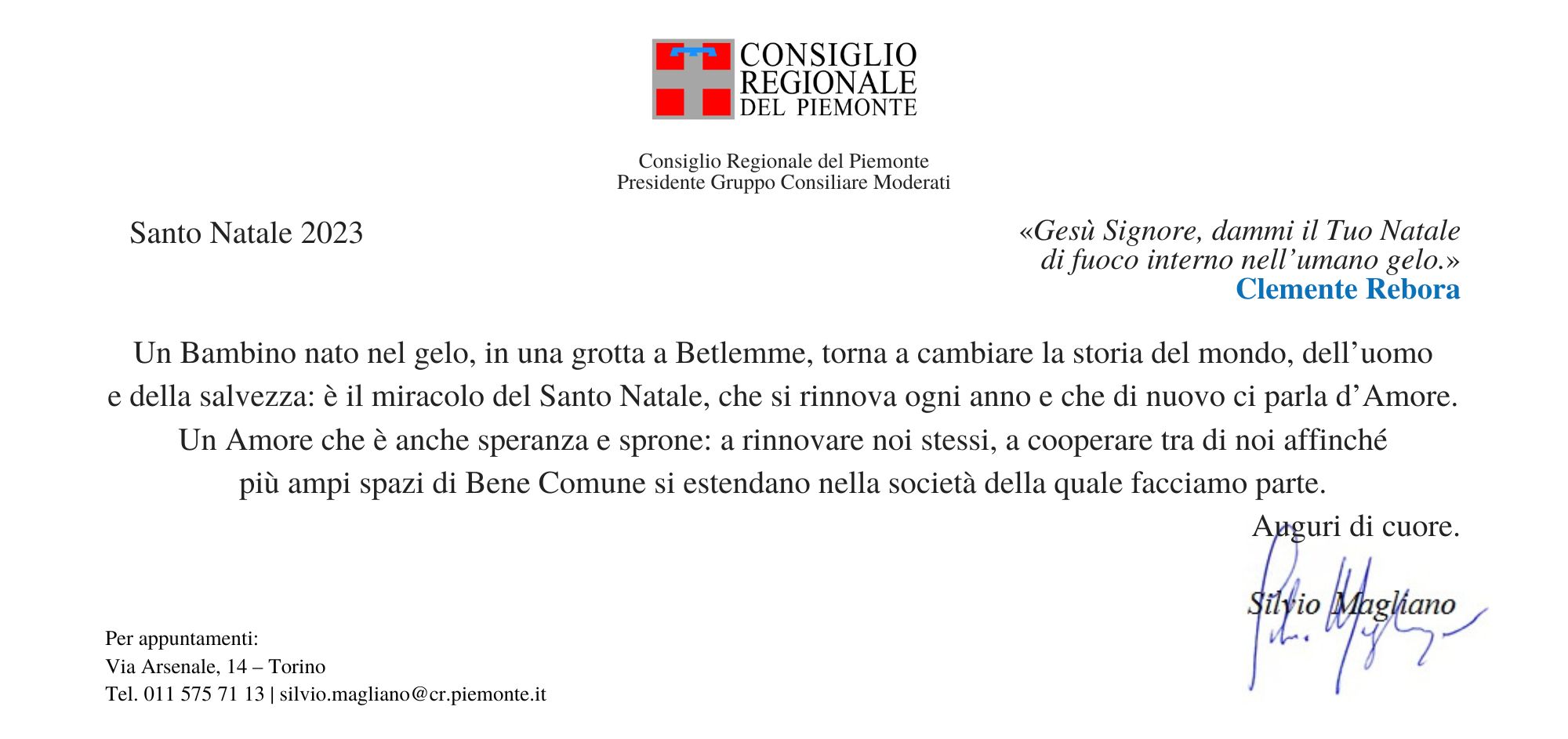 si chiude un anno, si avvicina il tempo del Santo Natale: due momenti che ci accompagnano verso la fase finale dell’attuale legislatura regionale. Non mancano le ragioni oggettive e contingenti che mi portano alla stesura di questa ormai tradizionale lettera di fine anno; a queste si aggiungono quelle soggettive e personali, ancora più importanti: il piacere di raccontarti la mia attività, di fare il punto della situazione su dodici mesi, anzi su quasi cinque anni, di lavoro. Tante cose sono successe da quell’ormai lontano 26 maggio 2019, data del voto e della mia elezione in Consiglio Regionale del Piemonte.
