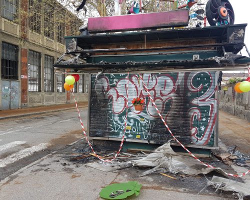 Edicolarte, l’ “Edicola d’artista” all’angolo tra corso Vercelli e via cuneo, è stata data alle fiamme questa notte dai soliti noti. Gli stessi, evidentemente, che avevano espresso il loro non-gradimento per il frutto di un anno di lavoro da parte di decine di artisti e cittadini con alcuni inequivocabili graffiti (vedi foto).